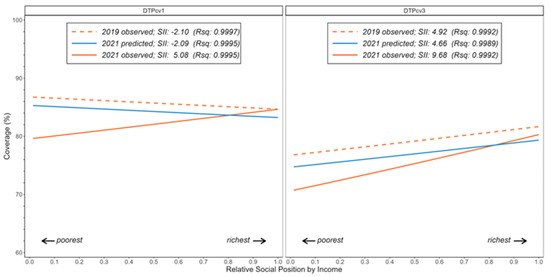 Moreover, there were clear regional inequality gradients in DTPcv1 and DTPcv3 coverage that were evident across the social hierarchy (“social hierarchy” refers to the cross-country gradient formed when countries are ranked by GDP per capita from poorest to richest) as defined by country GDP per capita (Table 2). The pro-poor inequality pattern in DTPcv1 coverage, initially observed in 2019 (and predicted by 2021), was inverted in 2021; the SII increased from −2.10 %pt DTPcv1 in 2019 to 5.08 %pt in 2021. The pro-rich inequality pattern in DTPcv3 coverage became more evident between 2019 and 2021, with the SII rising from 4.92 %pt in 2019 to 9.68 %pt in 2021 (Figure 3).