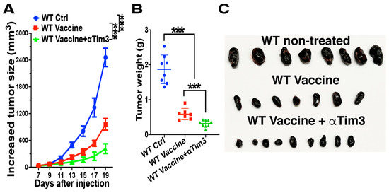 We further investigated the anti-tumor effects of combining DC-targeted vaccines with anti-Tim-3 treatment. Anti-Tim-3 treatment significantly improved the anti-tumor efficacy of DC vaccines, leading to a much-reduced tumor growth and tumor mass (Figure 6). As anti-Tim-3 treatment alone has limited or no anti-tumor efficacy in the B16 melanoma model [66,67,68,69], these data suggest that Tim-3 blockade synergizes with DC vaccines to improve their anti-tumor efficacy. In conclusion, we identified the β-catenin/Tim-3 axis as a novel mechanism that inhibits DC-mediated CD8 T cell responses, thereby supporting Tim-3 as a new target for therapeutic intervention to improve the anti-tumor efficacy of DC vaccines.