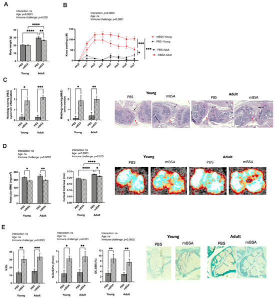 Age affects knee swelling but not bone alteration in mBSA-induced arthritis mouse model. AIA and control young and adult mice groups were immunized with mBSA and PBS (PBS young = 6, mBSA young = 9, PBS adult = 8, and mBSA adult = 12). Antigen challenge was repeated intra-articularly after seven days, and knee joint swelling was measured daily over seven days: (A) body weight of the mice at termination; (B) the difference in knee swelling from baseline in micrometers (µm) in mice challenged with mBSA of both young and adult groups; (C) histological scoring (0–3) of synovial inflammation and bone erosions after seven days from the difference from the baseline. On the right are representative images of hematoxylin and eosin staining of both young and adult PBS vs. mBSA knee joints. The red arrow indicates bone erosion, and the black arrow indicates synovial inflammation. Bone phenotype assessment with pQCT analysis: (D) trabecular bone BMD in mg/cm3; cortical thickness on the diaphyseal region (mm); representative images of pQCT analysis both in young and adult PBS vs. mBSA tibia; (E) number of osteoclast on the tibial epiphyseal region; the N.Oc/B.Pm (1/mm) and Ob.S/BS. Statistical evaluations were performed using a two-way analysis of variance (2 way ANOVA) to evaluate the effect of age, the effect of immune challenge, and the interaction between age and immune challenge. Two-way analysis to compare the interaction is stated at the top of each figure, followed by Fisher’s LSD multiple comparisons test where a significant difference is indicated with stars in the figure. Results are shown as bar graphs with mean ± SE. For histological examination, Mann–Whitney non-parametric tests were performed. * p < 0.05, ** p < 0.01, *** p < 0.001 and **** p < 0.0001. AIA—antigen induced arthrthis; mBSA—methylated bovine serum albumin; BMD—bone mineral density; B.Pm—bone perimeter; BS—bone surface.