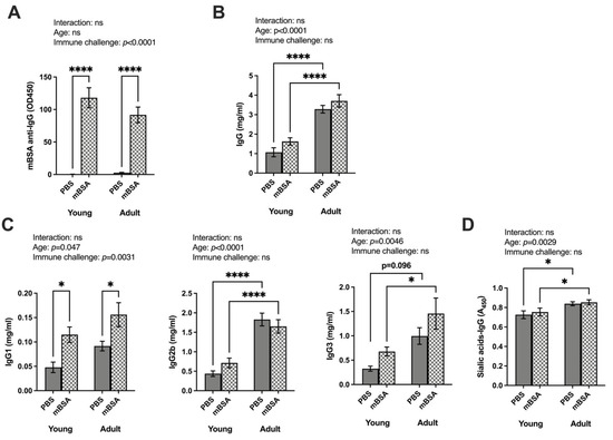 We observed no significant interaction between age and immune challenge on the level of immunoglobulin (Figure 2). Following mBSA injection, anti-mBSA specific IgG was detectable in both young and adult AIA immune challenge mice, with no age-dependent difference (Figure 2A). Total IgG concentrations remained unaffected by the immune challenge (Figure 2B). In addition, an age-dependent difference was displayed in both mBSA- and PBS-challenged adult mice, with higher IgG levels in adults compared to their younger counterparts. Different IgG subtypes showed that IgG2b and IgG3 levels increased with age, independent of immune challenges (Figure 2C). IgG1 levels were altered depending on immune challenges, while with ANOVA, an age-dependent increase was also displayed. Similarly, IgM levels increased with age and only a limited response to immune challenges, as indicated in the ANOVA (Figure S2). In terms of sialylation, total IgG (both Fab and Fc parts) was significantly higher in adult mice unaffected by immune activation (Figure 2D).