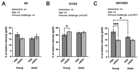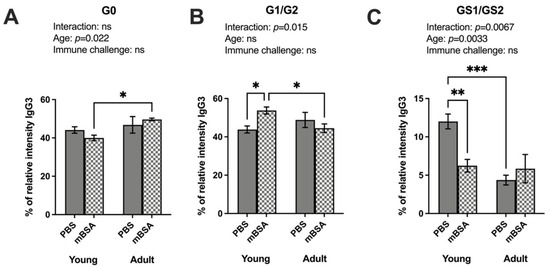 Detailed examination of IgG-Fc glycosylation identified specific glycoforms for the IgG2b and IgG3 variants. We identified 13 different glycoforms in the IgG-Fc region of the IgG2b isotype (Uniprot entry P01867, peptide sequence EDYNSTIR) and further grouped them as A-galactosylated (G0), galactosylated (G1/G2), and sialylated (G1S/G2S) (Supplementary Table S1). Although no significant interaction between age and immune challenge on IgG2b–glycosylation was found, immune challenge significantly affected the galactosylation and sialylation levels (Figure 3). Inflammation and age did not affect the A-galactosylated IgG2b levels (Figure 3A). Young mBSA-treated mice exhibited significantly higher galactosylation than their PBS counterparts (Figure 3B). Specifically, the highly galactosylated H5N4FG2 isoform with fucose was found to be increased in young mice following the immune challenge (Supplementary Table S1). Sialylation of IgG2b was significantly decreased in young mice upon immune challenge, yet no change was observed dependent on the immune induction in the adult mice (Figure 3C). Despite no age-dependent difference in the ANOVA, the post hoc test displayed a significantly lowered frequency of sialylation in the adult PBS control mice compared to young PBS controls. The highly sialylated H5N4FG2 glycoform was decreased in both immune-induced and aged mice groups (Table S1). The reduction in sialyation was pronounced in adult mice, implying that H5N4FG2 may have a role in modulating the pathogenicity of IgG2b.