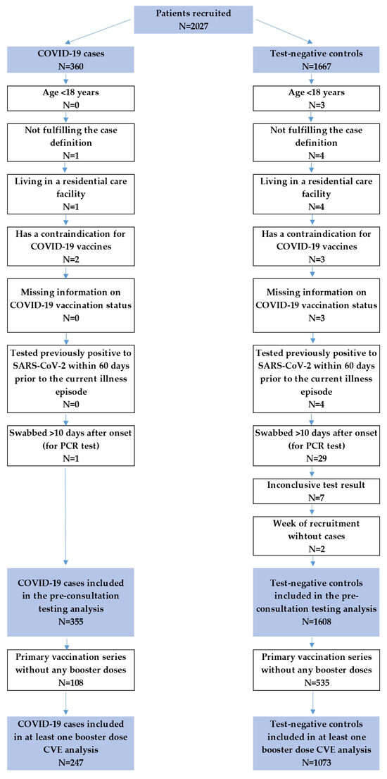 Patients who did not meet the case definition were under 18 years of age, lived in a residential care facility, had a contraindication to COVID-19 vaccination, lacked information on COVID-19 vaccination status, had previous COVID-19 less than 60 days before the current onset, were swabbed for PCR more than 10 days after the onset of symptoms, or had inconclusive test results in relation to the current symptoms (previous positive and current negative SARS-CoV-2 PCR test result), and thus were excluded from the study.