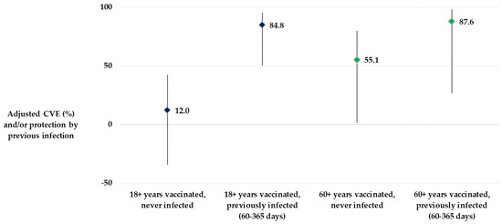 The higher number of contacts and the increased risk of SARS-CoV-2 infection from these contacts in younger age groups may partly explain the lower CVE among them [22,23]. In addition, both previous undiagnosed COVID-19 and COVID-19 vaccine hesitancy may be more prevalent in the young adult population, which could reduce the value of the CVE estimate in the 19–64 age group [24,25,26].