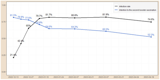 The temporal changes in COVID-19 infection rate and an intention to receive the second booster vaccination.
