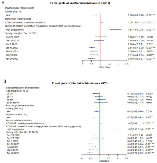 Among the respondents who were uninfected with COVID-19, in the multivariate logistic regression analysis, variables that remained in the model included anxiety (ORm = 0.68, 95%CI: 0.59 to 0.78), COVID-19-related preventive behaviors (ORm = 1.08, 95%CI: 1.05 to 1.12), high engagement in COVID-19-related information (ORm = 1.84, 95%CI: 1.55 to 2.18), and survey time (ORm trend: z-value: −2.10, p = 0.035) (Table A3, Figure 2A). Among the respondents who had a history of COVID-19 infections, variables that remained in the final multivariate model included age group (26- vs. 18-, ORm = 0.78, 95%CI: 0.66 to 0.93), anxiety (ORm = 0.81, 95%CI: 0.68 to 0.96), depression (ORm = 0.78, 95%CI: 0.66 to 0.92), COVID-19-related preventive behaviors (ORm = 1.07, 95%CI: 1.04 to 1.11), high engagement in COVID-19-related information (ORm = 1.82, 95%CI: 1.53 to 2.16), and survey time (ORm trend: z-value: −2.10, p = 0.035) (Table A3, Figure 2B). Compared with the respondents who were uninfected with COVID-19, age and depression were negatively associated with vaccination intentions among respondents who had a history of COVID-19 infection.