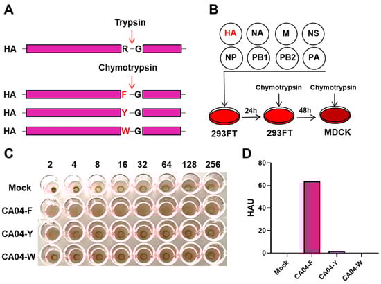 The generation of the chymotrypsin-dependent influenza virus. (A) Mutations in the cleavage site of the influenza virus ensure that it can potentially be cleaved by chymotrypsin. The mutated amino acids are marked in red. Hemagglutinin, HA; Arginine, R; Glycine, G; Phenylalanine, F; Tyrosine, Y; Tryptophan, W. (B) Flowchart of influenza virus generation based on reverse genetics. (C) Detection of hemagglutination activity of the generated influenza virus by HA assay. A/California/04/2009 (H1N1), CA04. (D) The hemagglutination unit (HAU) of the influenza virus in (C).