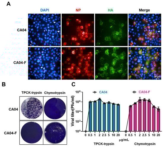Chymotrypsin is a type of serine protease that is typically highly expressed in the pancreas. It can specifically cleave peptide bonds formed by the C-terminus of F, Y, W amino acids, exhibiting good specificity. To construct a chymotrypsin-dependent influenza virus, the R at the cleavage site of A/California/04/2009 (CA04) HA was mutated to an amino acid site (F, Y, W) recognizable by chymotrypsin (Figure 1A), so that the cleavage site of the mutated HA could be recognized by chymotrypsin. Utilizing the reverse genetics system of the influenza virus, the mutated HA plasmid and the other 7 plasmids of CA04 were used for virus generation; in the culture and passage of the virus, chymotrypsin replaced the original TPCK trypsin (Figure 1B). After the generated virus infected MDCK cells for 48 h, a hemagglutination assay was used to detect the titer of the influenza virus in the supernatant. The results show that hemagglutination could be detected under the cultivation conditions with chymotrypsin after mutating 344R to F and Y, with mutations to F yielding a higher titer (Figure 1C,D). In contrast, mutations to W and the negative control did not display this phenomenon (Figure 1C,D), suggesting successful influenza virus generation following mutations to F and Y.