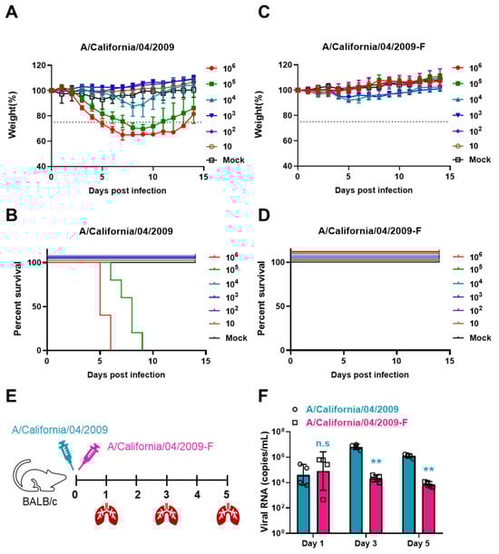 To assess the safety of CA04 and CA04-F, seventy 6-week-old female BALB/C mice were purchased from the Shanghai Slake Laboratory Animal Co., Ltd. (Shanghai, China). The mice were randomly divided into 14 groups, with 5 mice per group to assess the safety of the influenza viruses. A/California/04/2009-F mutation (CA04-F) and A/California/04/2009 (CA04), each with a titer of 106 pfu/mL, were diluted to 105, 104, 103, 102, and 101 pfu/mL. The mice were anesthetized using isoflurane in an anesthesia machine. Subsequently, 6 different titers of CA04 and CA04-F viruses (50 μL) were administered into the nasal cavity of each mouse to form 12 groups. The mice of the other 2 groups administered PBS (50 μL) into the nasal cavity as a control. Adequate food, water, and appropriate breeding conditions were provided. The weight and survival rate of the mice were monitored daily. For the purpose of calculating survival rates, a mouse was considered dead when its weight decreased by 25% from its initial weight.