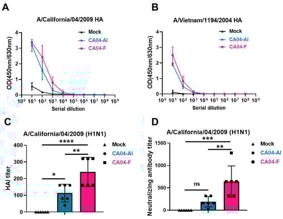 Humoral immune response in mice post mucosal immunization with CA04-F or intramuscular immunization with the mixture of inactivated CA04 and aluminum adjuvant. (A,B) The binding activity of the immunized mouse serum to A/California/04/2009 (H1N1) and A/Vietnam/1194/2004 (H5N1) HA. Data are presented as the mean ± s.d. values (n = 6). (C) The hemagglutination inhibition (HAI) activity of immunized mouse serum against H1N1. (D) The neutralization activity of immunized mouse serum against H1N1. Data are presented as the mean ± s.d. values (n = 6) in (C,D). Statistical analysis was performed by one-way ANOVA in (C,D). ns, no statistical significance; * p < 0.05; ** p < 0.01; *** p < 0.001; **** p < 0.0001. Mucosal immunization with CA04-F, CA04-F; intramuscular immunization with the mixture of inactivated CA04 and aluminum adjuvant, CA04-Al.