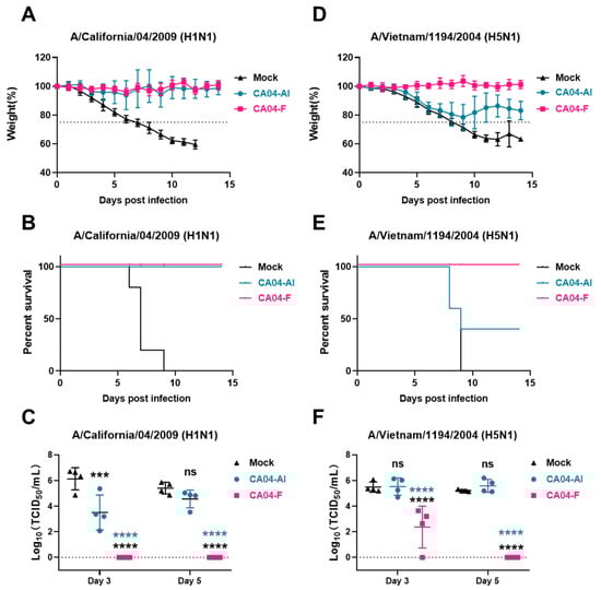 Broad-spectrum protective activity of CA04-F mucosal immunization against H1N1 and H5N1. (A–C) The protective activity of CA04-F mucosal immunization or inactivated CA04 intramuscular immunization against H1N1. Mice immunized with mock, CA04-F mucosal immunization or inactivated CA04 via intramuscular injection were challenged with a lethal dose of A/California/04/2009 to assess the effectiveness of the vaccines. The weight and survival rate of the mice were monitored, and weight curve (A) and survival rate curve (B) were plotted. Lung tissue from the mice was harvested on day 3 and day 5 post-virus infection for the detection of influenza virus titer (C). (D–F) The protective activity of CA04-F mucosal immunization or inactivated CA04 intramuscular immunization against H5N1. The weight and survival rate of the mice were monitored, and the weight curve (D) and survival rate curve (E) were plotted. The titers of the influenza virus in the lung tissues of mice on day 3 and day 5 post virus infection were presented (F). Data are presented as the mean ± s.d. values (n = 5) in (A,D). Statistical analysis was performed by two-way ANOVA in (C,F). ns, no statistical significance; *** p < 0.001; **** p < 0.0001.