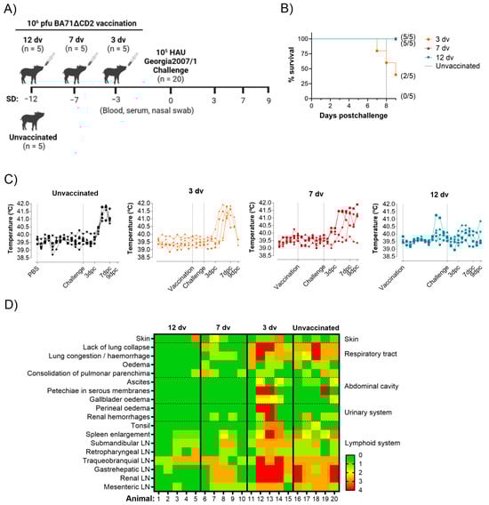 We have previously demonstrated that a single intranasal dose of 106 pfu of BA71ΔCD2 confers solid protection against a lethal infection with the ASFV strain Georgia 2007/01 at 21 days postvaccination []. Here, we aimed to elucidate the onset of this cross-protection by vaccinating animals (five pigs/group) 12 days (12 dv), 7 days (7 dv) and 3 days (3 dv) before an intranasal challenge with the virulent strain Georgia 2007/01 (105 HAU). A group of five pigs was left unvaccinated as the control (Figure 1A). The animals were monitored daily to observe clinical signs and sacrificed at 9 days postchallenge (dpc) to further observe ASF-compatible macroscopic lesions. All the unvaccinated animals synchronously succumbed to the disease at 8 dpc (Figure 1B), demonstrating the validity of the lethal challenge model used. In contrast, on the day of sacrifice (9 dpc), two out of five pigs from the 3 dv group and all the animals from the 7 dv and 12 dv groups were still alive, indicating that the early immune response induced by BA71ΔCD2 is at least capable of delaying disease progression (Figure 1B). Daily measured temperatures and necropsy examinations correlated with the survival trends observed (Figure 1C,D). The pigs from the 3 dv group presented the same temperature pattern as the unvaccinated animals and similar severe lesions in most tissues, characteristic of acute ASF disease. Interestingly, the 7 dv group showed a slight delay in temperature rise and more moderate lesions, which were mainly concentrated on lymph nodes, suggesting that vaccine-induced early immunity reduces disease severity. In clear contrast, the animals from the 12 dv group showed rectal temperatures below 41 °C, and the numbers of animals and tissues affected by ASF lesions were much lower than in the other groups. These results indicate that animals vaccinated with BA71ΔCD2 12 days before a challenge can control a lethal ASFV infection (Figure 1C,D).