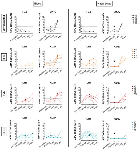 Pigs vaccinated 12 days before the ASFV lethal challenge control viremia and viral shedding. Virus titers in whole blood and nasal swabs measured by qPCR at the indicated time points after intranasal vaccination and challenge. Genomic equivalent copies (GECs) of ASFV were quantified by the detection of the gene LacI, which replaces CD2v in the attenuated BA71ΔCD2 strain, and the CD2v gene, which is encoded in the virulent Georgia 2007/1 genome. The arrows represent the vaccination (for LacI) or challenge (for CD2v) time points. The black dotted lines represent the limit of detection of each assay, and values below are considered indeterminate or negative. Symbols represent the mean of duplicates.