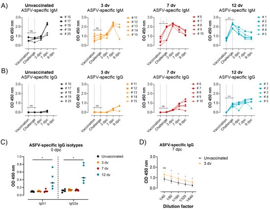 The presence of ASFV-specific IgG before the challenge, but not IgM, is associated with the control of infection. The induction of ASFV-specific IgM (A) and IgG (B) antibodies was measured for each animal by an ELISA at the indicated time points. Black dotted lines represent the vaccination and challenge time points. (C) Analysis of ASFV-specific IgG1 and IgG2 isotypes in sera (1/100 dilution) at 12 days postvaccination. (D) ASFV-specific IgG antibody titers were compared between unvaccinated animals and animals vaccinated 3 days prior to the challenge. The mean and standard deviation of the average IgG levels from each group and time point are represented. Statistical significance was assessed by a paired t-test (ns p > 0.05; * p ≤ 0.05; *** p ≤ 0.001).