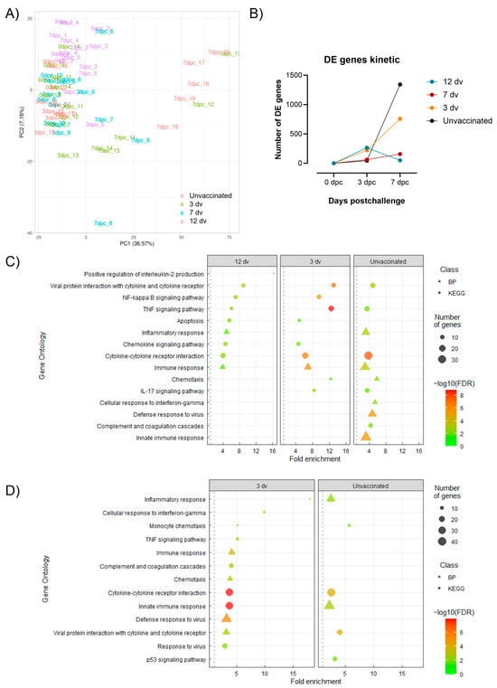 Time-resolved whole blood transcriptomic changes after Georgia 2007/1 infection. (A) PCA of the normalized RNA-seq expression levels (log2CPM) of the top 500 most variable genes. (B) Number of DE genes with an absolute fold change |FC| > 1.5 per time point in each group compared to 0 dpc. (C,D) List of representative Gene Ontology (GO) terms enriched in DE genes with an absolute fold change |FC| > 1.5 from vaccinated and unvaccinated pigs at 3 dpc (C) and 7 dpc (D). The size of the dots represents the number of DE genes associated with the GO term; the shape indicates the GO database (BP; biological processes) or the Kyoto Encyclopedia of Genes and Genomes (KEGG); and the color indicates the negative log10 value of the false discovery rate (FDR).