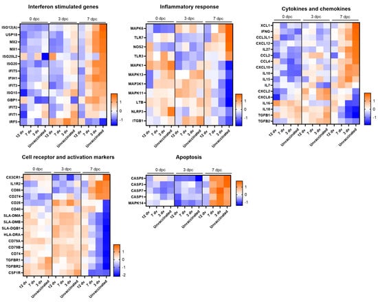 To corroborate that the animal health status of each experimental group was reflected in their respective whole blood transcriptomes, we next focused on the analysis to identify a pathology-associated transcriptomic signature. Thus, DE genes between 7 dpc and 0 dpc from the unvaccinated pigs were further analyzed, and their expression levels were compared among the different groups. From this analysis, genes representative of relevant immune processes and pathways are shown in Figure 5. In concordance with other studies [,], at 7 dpc, the unvaccinated pigs showed higher expression levels of genes related to inflammation and innate immunity. However, this marked difference was not evident at 3 dpc. Importantly, several type I interferon (IFN)-stimulated genes (ISGs) were strongly associated with disease progression, showing at 7 dpc a gradual upregulation depending on the time of vaccination before the challenge. A similar expression pattern was observed for several inflammatory mediators, cytokines, chemokines and cell receptor and activation markers (Figure 5). Of note, other genes showed an opposite pattern, being downregulated in the unvaccinated pigs compared to group 12 dv, indicating its potential role in protection. This might be the case for IRF5, a marker of inflammatory macrophages in vivo [], which also plays a critical role in the development of a Th1 response []. Several genes of the MAPK pathway were also downregulated in the unvaccinated animals, suggesting that this pathway is not involved in the inflammatory response associated with acute ASF disease. Other genes with a similar expression pattern illustrate the characteristic severe leukopenia of acute ASF infection. For instance, in the diseased groups, the B cell markers CD79A and CD79B, the T cell marker CD28, genes related to antigen presentation (SLAs, CD74), and the macrophage receptor CSF1R were also downregulated. Finally, genes related to apoptosis (MAPK14, CASP1-3-7-8), also characteristic of acute ASF infection, showed a clear association with a lack of protection. Indeed, expression levels at 7 dpc of several caspases were similarly upregulated in all the groups except for animals from group 12 dv. Overall, this expression pattern demonstrates that the time of vaccination before viral infection clearly influences the kinetics of the immune system response to virus exposure.