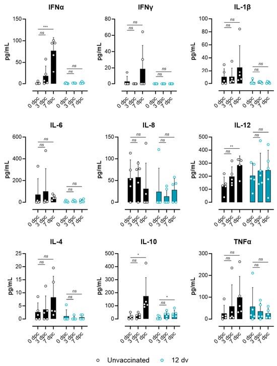 Lack of an inflammatory-associated cytokine signature at day 9 postchallenge in pigs vaccinated 12 days before the challenge. Cytokine levels in sera from unvaccinated (black symbols) and 12 dv group animals (blue symbols) at the indicated time points were quantified by a Luminex-based multiplex assay. The mean and standard deviations from each group are represented. Statistical significance was determined by an unpaired t-test (p > 0.05 ns; * p ≤ 0.05; ** p ≤ 0.01; *** p ≤ 0.001).