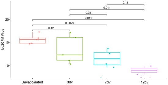 RNA-seq-derived number of counts mapping to ASFV genes in blood from unvaccinated and vaccinated pigs. Statistical significance was determined by a Wilcoxon test (p-values are shown).