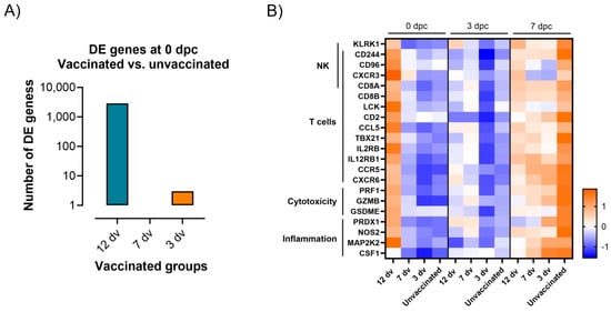 Differentially expressed genes associated with protection against ASFV in vaccinated and unvaccinated pigs before the challenge. (A) The number of differentially expressed (DE) genes in each vaccinated group compared to the unvaccinated group at 0 dpc. (B) Heatmap depicting normalized RNA-seq-derived log2CPM values of representative DE genes in the categories indicated.