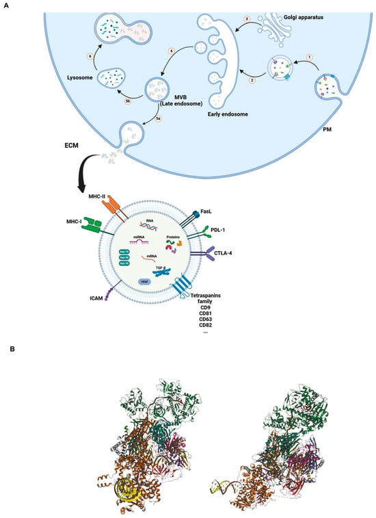 (A) Mechanism of synthesis and release of EVs. Inward budding of plasma membrane (PM) toward cytosol led to the formation of early endosome (1 and 2); communication between early endosome and Golgi apparatus formed and released late endosome or multivesicular bodies (MVB) (3 and 4); upon fusion of MVB with PM, exosomes are released into the ECM (5a); combination of MVB with lysosome result in degradation of MVB in cytosol (5b and 6). (B) Three-dimensional structural views of the human nuclear exosome-MTR4 RNA complex. (The structure is publicly available at the link: https://www.rcsb.org/3d-view/6D6Q/1, accessed on 6 March 2024).
