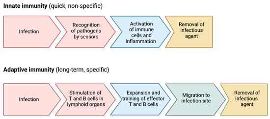 Immunity refers to the body’s ability to defend itself against invading organisms []. The body has two intrinsic defense mechanisms against pathogens (Figure 2). The first method, intrinsic in the body, is known as innate immunity. This includes the phagocytosis of bacteria and other pathogens by white blood cells (damage-associated molecular patterns (DAMPs) released from dying cells, which lead to recognition of them), the skin’s resistance to organism attacks, and the presence of specific chemical factors capable of killing microbes []. The second type of immunity, known as acquired or adaptive immunity, is recruited when an organism enters the body, and the body responds with specific reactions to protect itself from that particular foreign organism []. There are two primary types of adaptive immunity. One involves the production of antibodies by B-lymphocyte cells, referred to as humoral immunity. The second type of acquired immunity is generated by the activation of T-lymphocyte cells, known as cellular immunity. These activated T-cells digest and eliminate microbes and invading factors [,,,,].
