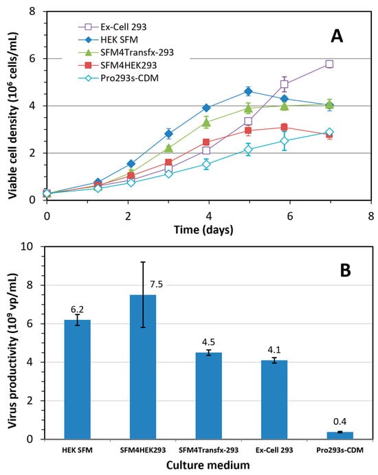 (A) Growth of HEK 293SF cells in batch cultures cultivated in four commercial and one in-house-developed serum-free media (HEK SFM); (B) Volumetric productivity of Ad5-GFP in batch cultures grown in the above five media to 1 × 106 cells/mL and then infected with Ad5-GFP at an MOI of 10. Mean and standard deviation of two independent cultivations.