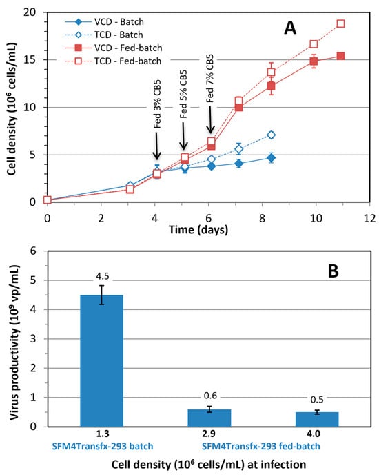 (A) Growth of HEK 293SF cells in fed-batch culture cultivated in SFM4Transfx-293 medium and fed with CB5; (B) Comparison of volumetric productivity of Ad5-GFP in batch cultivated in SFM4Transfx-293 medium and fed-batch cultures fed with CB5, and infected at three different cell densities. Mean and standard deviation of two independent cultivations.