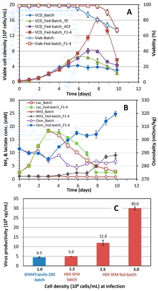 Maintaining cell-specific virus productivity in fed-batch bioreactor culture through the improvement of culture media and feed: HEK SFM medium was fortified with 1 g/L ACF before being used for the bioreactor inoculation. Glucose was included in the first feed to provide an additional 2 g/L glucose (final concentration) in the bioreactor culture to avoid glucose depletion. Figure 7A depicts the growth profile of HEK 293SF cells in 3 L fed-batch bioreactor culture under improved nutritional conditions. The total cell density at infection was 4.8 × 106 cells/mL with a viability of 98%, and reached 6.2 × 106 cells/mL with a viability of 73% at 48 hpi. The glucose was not depleted in the culture during the time course. The maximal molar lactate and ammonia concentrations reached 57 and 2.8 mM, respectively, and the osmolality was 347 mOsm/kg at 48 hpi (Figure 7B).