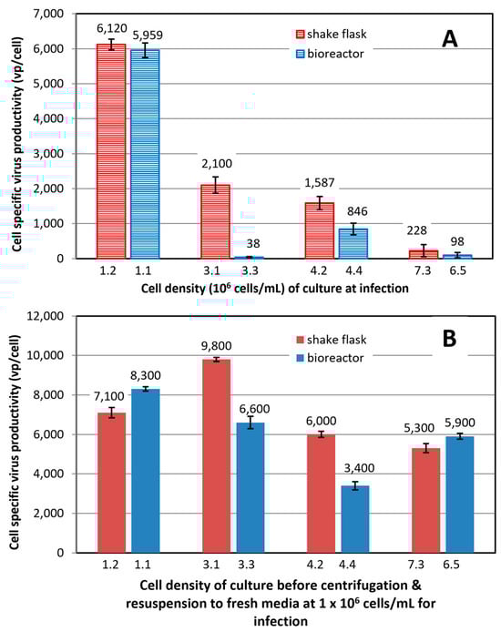 (A) Cell-specific productivity of cultures taken from a 2 L shake flask (with 700 mL working culture volume) and 3 L bioreactor fed-batch cultures grown to different cell densities, aliquoted to 125 mL shake flask at 25 mL each, and then infected with Ad5-GFP at MOI of 10; (B) Cell-specific productivity of cultures taken from the 2 L shake flask and 3 L bioreactor, and centrifuged; Cell pellet was suspended in fresh HEK SFM medium at 1 × 106 cells/mL, and then infected. Mean and standard deviation of two independent cultivations.