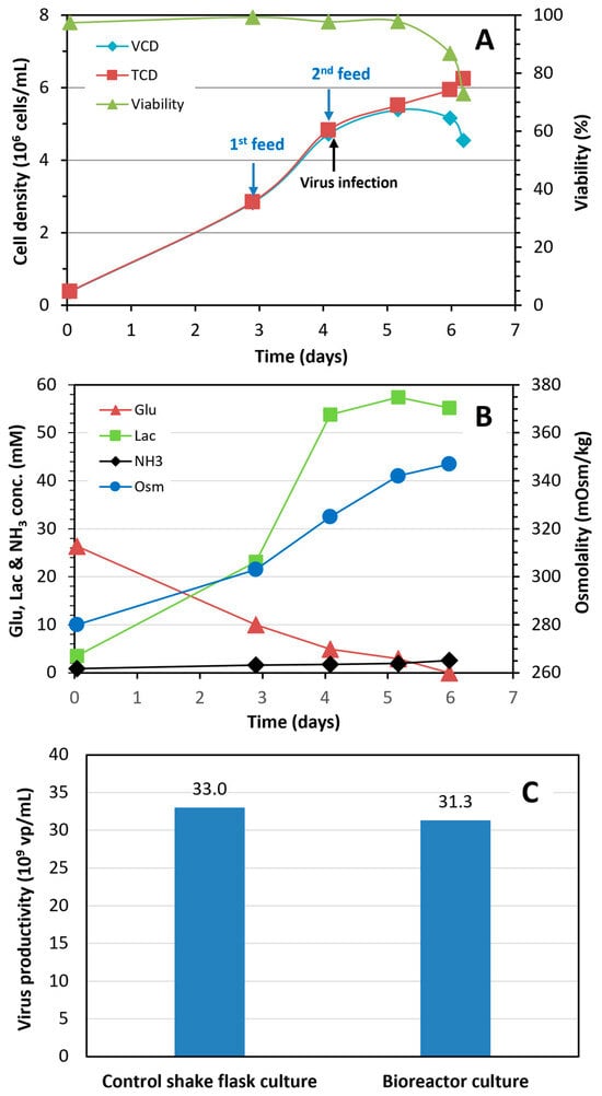 (A) Cell growth profile in a 3 L fed-batch bioreactor culture conducted under optimized feeding conditions for production of Ad5-GFP; (B) Culture osmolality and concentration of glucose, lactate and ammonia; (C) Volumetric virus productivity in control shake flask fed-batch culture infected at 5.2 × 106 cells/mL and bioreactor fed-batch culture infected at 4.8 × 106 cells/mL.