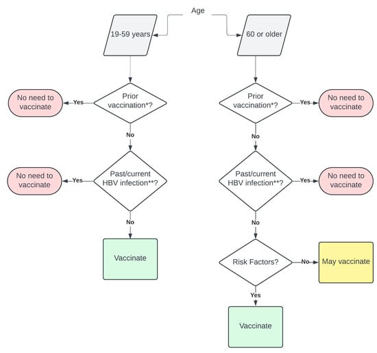 In April 2022, the CDC published updated recommendations for hepatitis B vaccination from the ACIP []. In addition to infant and childhood vaccination, all adults aged 19–59 years should receive an HBV vaccine series if they do not have a history of prior vaccination or of past or current HBV infection. In other words, the decision to vaccinate should be prompted by this age range, regardless of the presence or absence of HBV-related risk factors.