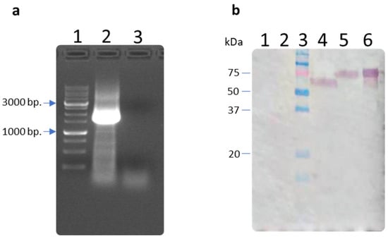 Figure 2. Expression of the hemagglutinin gene. (a) Electropherogram of RT-PCR products in 1% agarose gel: lane 1—1 kb DNA ladder (SibEnzyme); lane 2—use of total RNA pVAX-H5 as a template; lane 3—use of total RNA from pure cells as a template; (b) analysis of HA/H5 protein production in HEK293 cells by Western blotting using serum of a ferret immunized with influenza A (H5N8) virus: Lane 1—lysate of untransfected HEK293 cells; Lane 2—culture medium collected from untransfected HEK293 cells; Lane 3—molecular weight marker Precision Plus Protein Dual Color Standards (Bio-rad, Hercules, CA, USA); Lane 4—lysate of HEK293 cells transfected with plasmid pVAX-H5; Lane 5—culture medium collected from HEK293 cells transfected with the pVAX-H5 plasmid; Lane 6—recombinant hemagglutinin HA/H5 of influenza A virus (H5N8) (K+) [43].