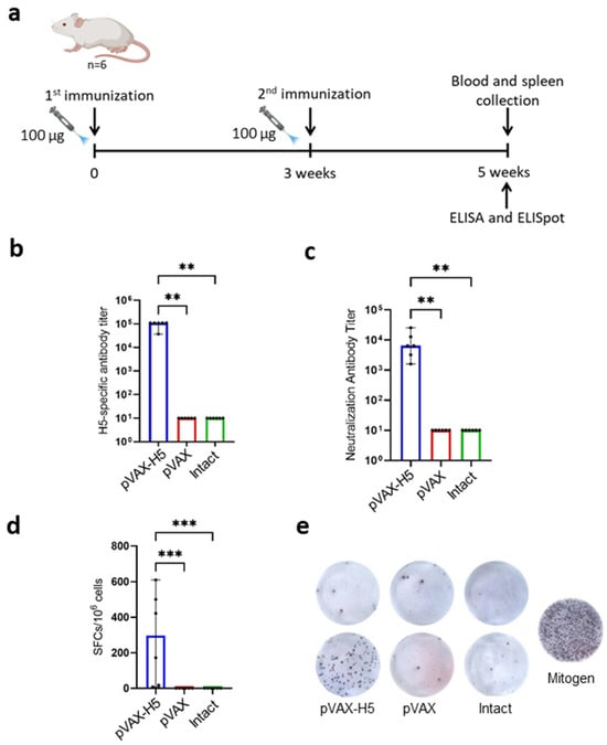 Figure 3. Analysis of humoral and cellular response to DNA vaccine pVAX-H5. (a) Scheme of mouse immunization. (b) Reciprocal titer (dilution) of hemagglutinin-specific antibodies detected in immune sera using ELISA. (c) The neutralization activity of immune sera against influenza virus A/turkey/Stavropol/320-01/2020 (H5N8). Reciprocal titer values are provided in the plot. (d) ELISpot results. Number of splenocytes expressing IFN-γ in response to stimulation with a pool of specific peptides, determined by ELISpot. Each bar represents the average number of IFN-γ spot-forming cells (SFCs) per million splenocytes stimulated. (e) The representative images of ELISpot wells (top row: splenocytes not stimulated with peptides; bottom row: splenocytes stimulated with peptide pool or a mitogen). pVAX-H5—a group of animals immunized with the liquid form of the pVAX-H5 DNA vaccine; pVAX—group of animals immunized with the pVAX1 vector; intact—a group of animals that have not been subjected to any manipulation. In panels (bd), data are provided as median with range. Significance was calculated using non-parametric one-way Kruskal–Wallis analysis of variance with correction for multiple comparisons and Dunn’s statistical hypothesis test (** p < 0.01, *** p < 0.001).