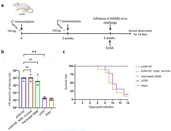 Figure 4. Immunogenic and protective properties of DNA vaccine pVAX-H5. (a) Scheme of mice immunization and virus challenge. (b) ELISA results. Reciprocal titer values are provided in the plot. Data are provided as median with range. Significance was calculated using non-parametric one-way Kruskal–Wallis analysis of variance with correction for multiple comparisons and Dunn’s statistical hypothesis test (** p < 0.01, ns: no significance). (c) Survival curves of immunized animals after infection with the influenza virus strain A/Astrakhan/3212/2020 (H5N8). Survival function modeling was performed using the Kaplan–Meier multiplier estimator, and comparison of survival with the control group was performed using the Mantel–Cox test. pVAX-H5—a group of animals immunized with the liquid form of the pVAX-H5 DNA vaccine; pVAX-H5, lyoph., sucrose—a group of animals immunized with a lyophilized form of DNA vaccine pVAX-H5; inactivated H5N8—a group of animals immunized with the inactivated H5N8 virus; pVAX—group of animals immunized with the pVAX1 vector; intact—a group of animals that have not been subjected to any manipulation.
