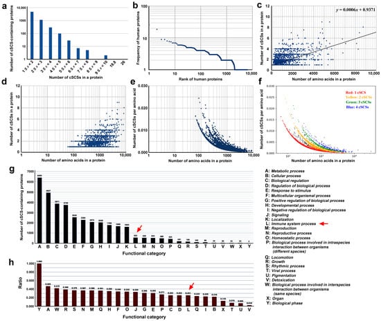 Informatical analyses of cSCS-containing human proteins. (a) Histogram of the number of proteins in response to the number of cSCSs in a protein. (b) Rank-frequency plot. Human proteins are ranked in the order of the number of cSCSs in a protein. (c) Scatter plot of the number of cSCSs in human proteins in response to the number of amino acids in a protein (protein length). A linear fit (y = 0.0006x + 0.9371) is shown. (d) The same scatter plot as (c) except for the log scale on the y-axis. (e) Scatter plot of the number of cSCSs per amino acid in response to the number of amino acids in a protein. The y-axis is shown on a log scale. (f) The same scatter plot as (e), except for the assigned colors. (g) Functional categorization of cSCS-containing human proteins in accordance with the GO assignments. The functional categories A–Y are shown on the right. The red arrow indicates the immune system process. (h) Ratio of the number of cSCS-containing proteins to all the proteins in a functional category. The red arrow indicates the immune system process.