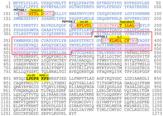 Furthermore, among these 17 proteins, the locations of cSCSs were examined visually with the help of 3D structural images. The following six species of cSCSs were detected on the surface of six human proteins: ryanodine receptor 3 (TLLAL), protein unc-80 homolog (EPLVD, PLVDL, and LPDPS), ryanodine receptor 1 (TLLAL), ryanodine receptor 2 (TLLAL), teneurin-4 (GTTLD), and neural cell adhesion molecule L1-like protein (PSKPS) (Figure 3). The data are compiled in Table 1. Their accessibility scores were also examined (Table 1), confirming the results of the visual inspection.