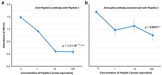 ELISA for antibody binding to the spike protein in the presence of Peptide 2 (ELISA #1B in Figure 1). The indicated p-values were obtained via two-sided unpaired Student’s t tests between the samples with the highest concentration tested (100 molar equivalent) and the samples with “no addition” of Peptide 2 (0 molar equivalent). The error bars indicate the standard deviation. Asterisks indicate statistical significance (**: p < 0.01, ***: p < 0.001). The molar equivalent was calculated by assuming that the molecular weight of IgG is 150 kDa. The molecular weight of Peptide 2 is 2917.5 Da. (a) Anti-Peptide 2 antibody in the presence of Peptide 2. (b) Anti-spike antibody (commercial) in the presence of Peptide 2.