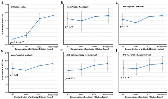 Inhibitory assay for the spike-ACE2 interaction (ELISA #2 in Figure 1). The indicated p-values were obtained by two-sided unpaired Student’s t tests between the samples with the least dilution factor and the samples with “no addition” of a potential inhibitor (control). The error bars indicate the standard deviation. Asterisks indicate statistical significance (***: p < 0.001). (a) Inhibitor control (ε-poly-L-lysine). (b) Anti-Peptide 1 antibody. (c) Anti-Peptide 2 antibody. (d) Anti-Peptide 3 antibody. (e) Anti-spike antibody (commercial). (f) Anti-IL-7 antibody.