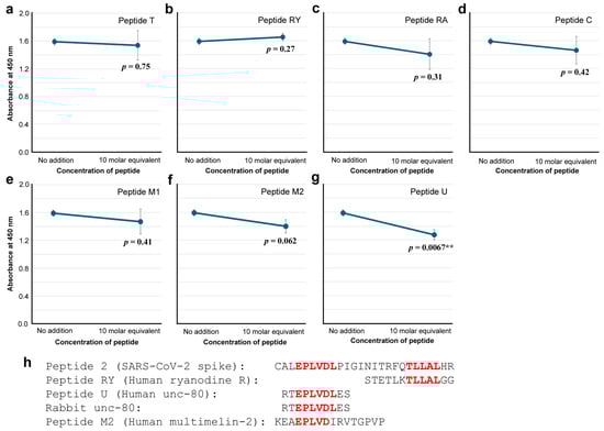 ELISA for anti-Peptide 2 antibody binding to the spike protein in the presence of a human-derived peptide (ELISA #3 in Figure 1). The indicated p-values were obtained by two-sided unpaired Student’s t tests between the sample with the peptide concentration tested (10 molar equivalent) and the sample with “no addition” of a peptide (control). The error bars indicate the standard deviation. Asterisks indicate statistical significance (**: p < 0.01). The molar equivalent was calculated by assuming that the molecular weight of IgG is 150 kDa. (a) Peptide T. (b) Peptide RY. (c) Peptide RA. (d) Peptide C. (e) Peptide M1. (f) Peptide M2. (g) Peptide U. (h) Important peptide and protein sequences, with cSCSs shown in red.