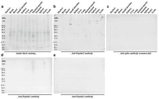 Western blot analyses of anti-spike antibodies. (a) Amido black staining confirm that the proteins were successfully blotted on the membrane. (b) Anti-Peptide 2 antibody. Intense signals were observed in the small intestine. Less intense signals were observed in the ovary, stomach, skeletal muscle, and other various tissues. (c) Anti-spike antibody (commercial). No signal was observed. (d) Anti-Peptide 1 antibody. Smear bands were observed in the ovary and skeletal muscles. (e) Anti-Peptide 3 antibody. No signal was observed. The original Western blot figures can be found in Figure S1.