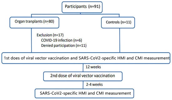As such, our study aimed to evaluate the immunogenicity of the two-dose ChAdOx1 nCoV-19 vaccine regimen in SOT recipients, focusing on their HMI, CMI, and, notably, B cell-specific immunity. Our primary objective was to assess the immunogenicity following ChAdOx1 nCoV-19 vaccination in SOT recipients. In addition, our secondary objective was to investigate the factors influencing immunogenicity in SOT recipients and to monitor any adverse events (AEs) that occurred following immunization.