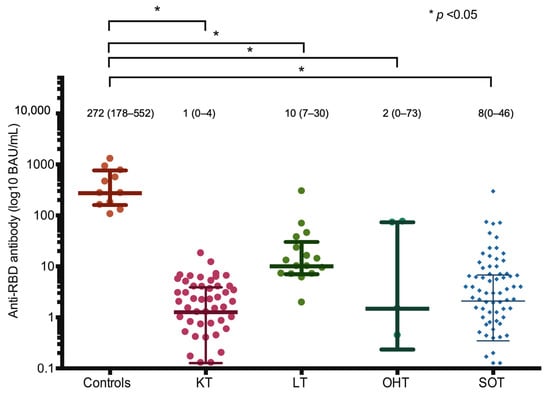 SARS-CoV-2 RBD-specific IgG antibody level 2–4 weeks post-second dose in healthy controls and SOT recipients. Bar represents IQR with the median (IQR) value. * p value < 0.05. Abbreviations: BAU, binding antibody unit; SOT, solid organ transplant; KT, kidney transplant; LT, liver transplant; OHT, orthotopic heart transplant; RBD, receptor-binding domain.