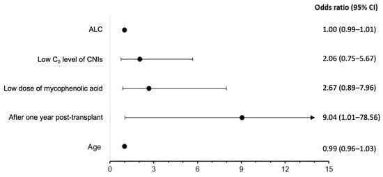 Baseline and transplant characteristics were collected comprising age, gender, organ transplant type, allograft type, onset after transplant, immunosuppressive regimen, and dosing. The classification of a low C0 level of calcineurin inhibitors (CNIs) was either cyclosporine of 150 or less ng/mL or tacrolimus of 5 or less ng/mL [17]. The classification of a low therapeutic dose of mycophenolic acid (MPA) was either mycophenolate sodium (MPS) of 720 or less mg/day or mycophenolate mofetil (MMF) of 1 g or less/day [18].