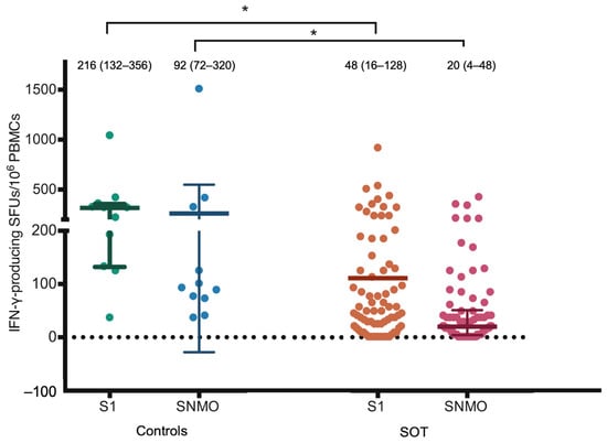 SARS-CoV-2-specific IFN-γ-producing T cell responses reactive to the S1 protein. SMNO protein detected by IFN-γ ELISpot assay 2–4 weeks post-second dose. Bar represents IQR with the median (IQR) value. * p value < 0.05. Abbreviations: IFN-γ, interferon-γ; SOT, solid organ transplant; SFUs, spot-forming units; PBMC, peripheral blood mononuclear cell; S, spike glycoprotein; S1, S1 domain of spike protein; S2N, spike and nucleoproteins; SNMO: peptide pool of spike protein, nucleoprotein, membrane protein, and open reading frame proteins.