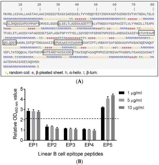S-ABC was previously identified via an immunoproteomic analysis with swine sera specific to S. suis serotype 2, indicating expression and exposure of the protein to the immune system during the natural infection of pigs [19]. The 419-amino-acid S-ABC protein is primarily a hydrophilic protein without a transmembrane domain. Results from a predictive antigenicity analysis using Protean software version 7.1 and VaxiJen version 2.0 ere consistent with the observed immunogenicity of the S-ABC protein (Supplementary Figure S2) [22]. The S-ABC sequence was then analyzed using ABCpred and IEDB bioinformatic tools to predict potential linear B cell epitopes. Results from this analysis, which identified five putative B cell epitopes, are shown in Figure 1A and Table 1.