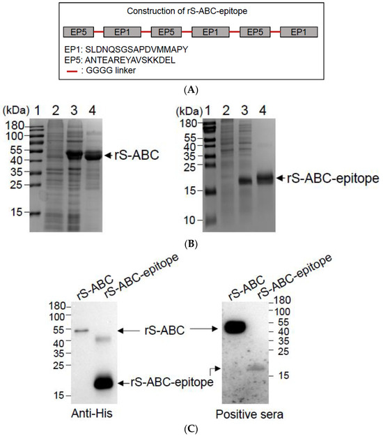 Construction and expression of rS-ABC and rS-ABC-epitope proteins. (A) Schematic representation of the construction of rS-ABC-epitope. EP1 and EP5 were tandemly connected by GGGG linkers to be expressed as a multiple-epitope protein. (B) Expression and purification of rS-ABC and rS-ABC-epitope proteins. The rS-ABC and rS-ABC-epitope proteins were expressed from E. coli, induced with IPTG, and purified via their His-tag by using a Ni–NTA column. The resulting recombinant proteins were then examined using SDS-PAGE. Lanes: 1, protein marker; 2, uninduced bacterial cells; 3, bacterial cells induced with IPTG; and 4, purified recombinant protein. (C) Antigenic analysis of rS-ABC and rS-ABC-epitope proteins. The rS-ABC and rS-ABC-epitope purified proteins were examined by a Western blot using anti-His antibodies and positive rabbit sera containing antibodies specific to S. suis serotype 2.