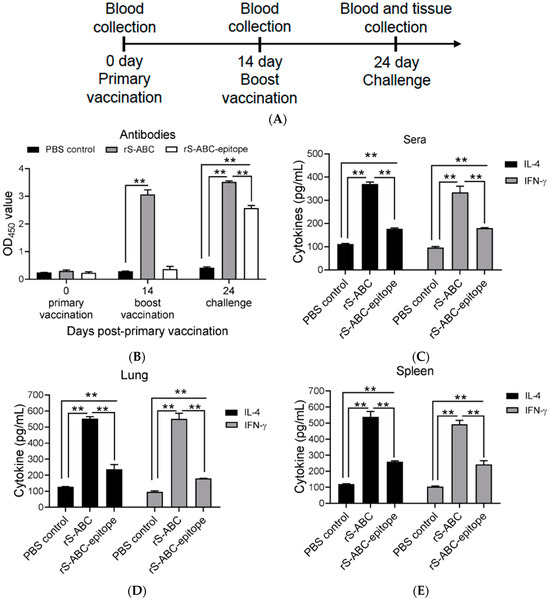 Levels of antibodies and cytokines in immunized mice. (A) Schematic representation of vaccination and sample collection. Mice were vaccinated with rS-ABC or rS-ABC-epitope proteins and then boosted at 14 days post-primary vaccination. (B) Levels of antibodies specific to rS-ABC or rS-ABC-epitope were examined with an ELISA in sera collected prior to primary vaccination, boost vaccination, and challenge. (C–E) Levels of IL-4 and IFN-γ in sera (B), lungs (C), and spleen (D) collected at 24 days post-primary vaccination were examined with an ELISA. Statistically significant differences between groups are indicated by asterisks (** p < 0.01).