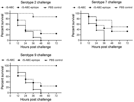The next series of experiments were designed to determine whether the observed differences in immunogenicity translated to differences in protection using both homologous as well as divergent, heterologous S. suis serotypes. Mice were immunized with rS-ABC or rS-ABC-epitope and challenged with a lethal dose (8 × LD50) of S. suis serotype 2, 7, or 9 (Figure 3A). The survival analysis presented in Figure 4 showed that rS-ABC provided substantial levels of protection (87.5% and 100%) against S. suis serotypes 2 and 9, with protection dropping to 50% for S. suis serotype 7. Consistent with the immunogenicity results, survival in rS-ABC-epitope-vaccinated mice was consistently lower, with levels of protection against the different serotypes ranging from 25% to 37.5% (Figure 4). Overall, these data indicate that rS-ABC was able to provide high levels of protection against S. suis serotype 2 and 9 challenges, and lower levels against S. suis serotype 7 challenges, with the full-length rS-ABC protein being far superior at all levels to the epitope-focused rS-ABC-epitope construct.