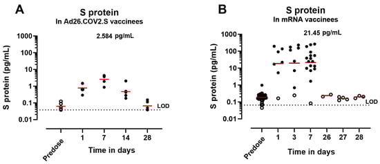 - Ogata, A.F.; Cheng, C.A.; Desjardins, M.; Senussi, Y.; Sherman, A.C.; Powell, M.; Novack, L.; Von, S.; Li, X.; Baden, L.R.; et al. Circulating Severe Acute Respiratory Syndrome Coronavirus 2 (SARS-CoV-2) Vaccine Antigen Detected in the Plasma of mRNA-1273 Vaccine Recipients. Clin. Infect. Dis. 2022, 74, 715–718. [Google Scholar] [CrossRef]