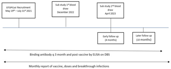 Timeline for main STOPCoV study and sampling times for neutralizing antibody sub-study. DBS—dried blood spot, ELISA—enzyme-linked immunosorbent assay.