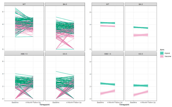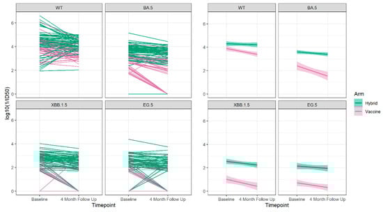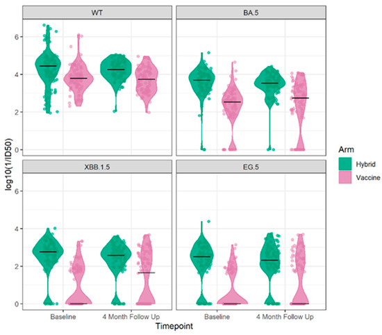 Overall, at the baseline visit, the proportion of participants with detectable neutralizing antibodies to each of the variants was decreased relative to Wuhan. Neutralizing antibodies to Omicron BA.5 were found in 92.1% of participants, while this was reported in 65.2% to Omicron XBB1.5 and 56.7% to Omicron EG.5. While 83–90% of those with hybrid immunity had a detectable neutralizing antibody to Omicron XBB.1.5 and Omicron EG.5 variants, this was only detectable in 29–40% of those with vaccine-only immunity. For those with detectable neutralizing antibodies the levels decreased with the evolution of the variants but, in each case, were higher for those with hybrid immunity, Figure 3.